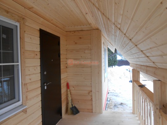 На террасе при условии что она есть делаем перила из строганной доски со всех сторон, столбы террасные также строганные, а не обрезки профилированного бруса с шипом и пазом. Домкратики на столбах для дальнейшей регулировки. Балясины будут сделаны аккуратно. Обратите внимание что в дешёвых случаях это может быть и будет просто вагонка прибирая к неотесанной доске снаружи и столбы будут не квадратные а просто профилированный брус как на видео.