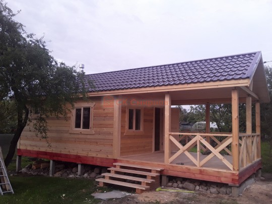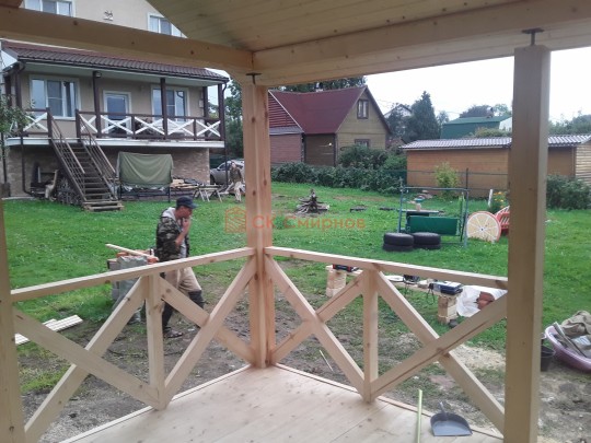 Обратите внимание на столбы, установленные на террасе: они закреплены на домкраты. Это делается для того, чтобы после усадки (а она будет даже при стройке из сухого бруса) можно было выставить нужный уровень. Это предотвратит перекосы крыши — всё продумано.