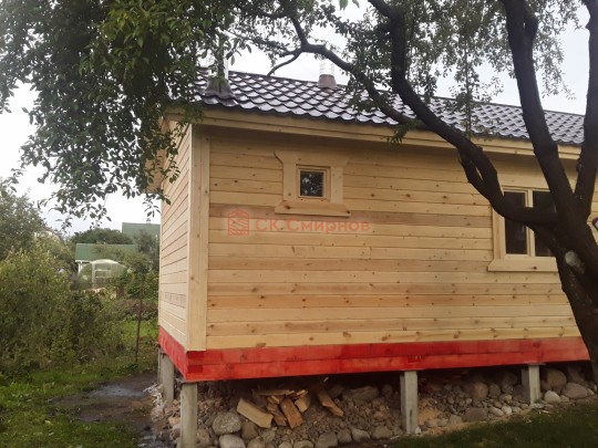 Баня установлена на забивные железобетонные сваи. Фундамент также делала наша специальная бригада монтажников. Стоимость монтажа свай под ключ вышла на уровне свайно-винтового фундамента.