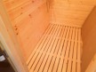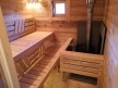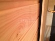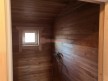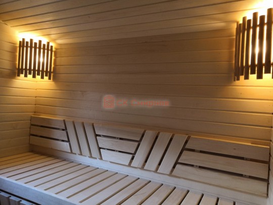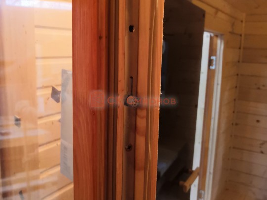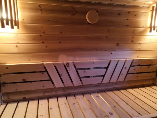 Кедровая вагонка в парной, спинки над пологами и декоративная решётка между пологами. Дверь крашеный усиленный стеклопакет (снаружи RAL 8017, изнутри «Жёлтый»);
