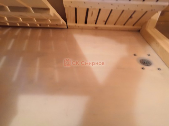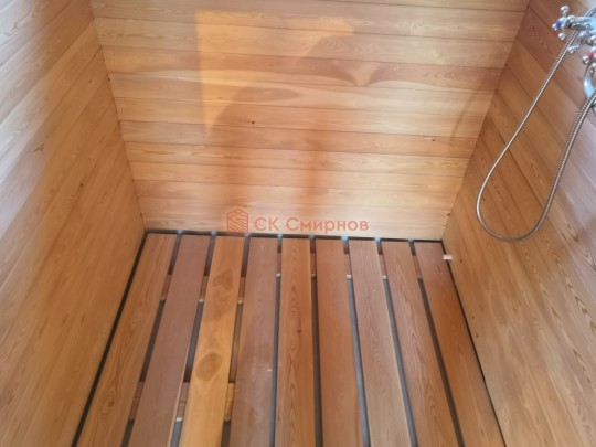 В комнате для приема душевых процедур на полу устанавливается душевой пластиковый поддон который имеет слив на улицу. В поддоне лежит деревянный трапик для удобства.