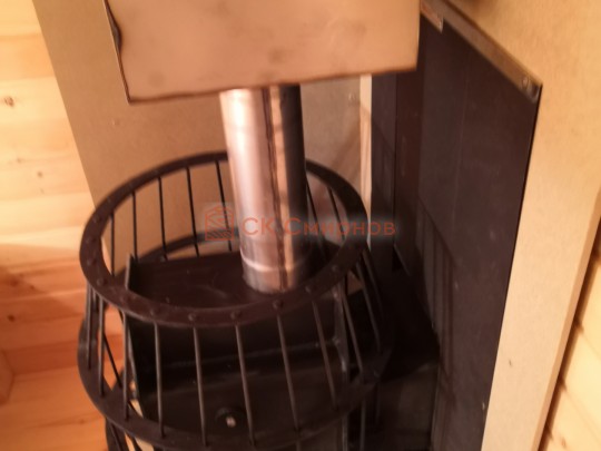 Установка печи Теплодар Русь сетка 12 л панорама ( со стеклянной дверцей ), трубы сэндвич, проходы и зонт входят в стоимость бани. Экран металлический через стену. На полу кладется кирпич, базальтовый картон, минерит. На стенах базальтовый картон, минерит, через втулки прикручивается минерит. Ссылка на сайт производителя https://www.teplodar.ru/catalog/detail/rus_setka_12_l_panorama/