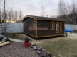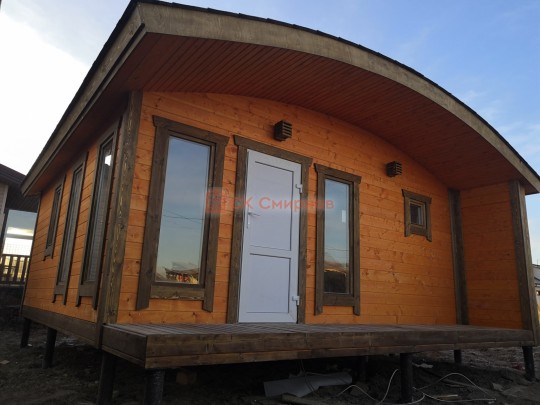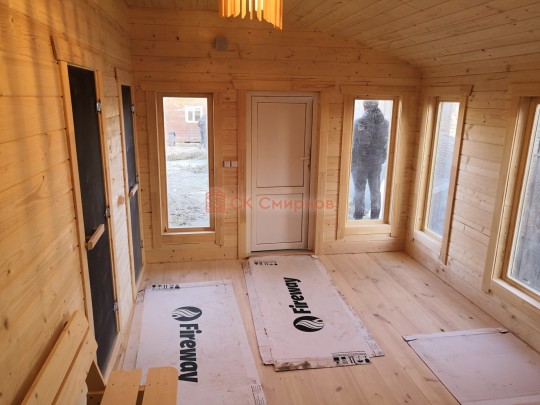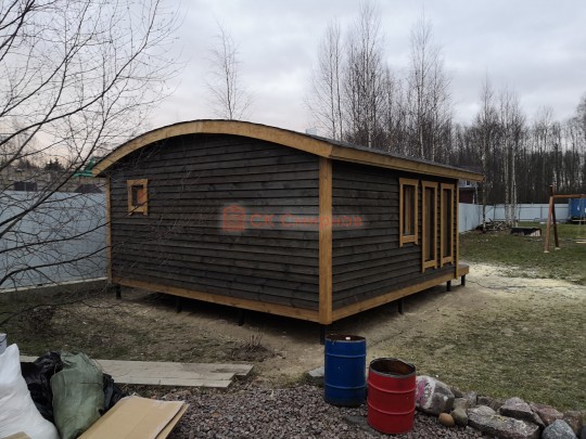Для строительства этой красивой каркасной бани 5х6 метров СК Смирнов разработал авторский проект №217 с обустроенной парной из алтайского кедра и комнатой отдыха. По планировке общая площадь составляет 32 квадратных метра — есть сауна и просторная жилая комната с впечатляющими панорамными окнами во всю стену.