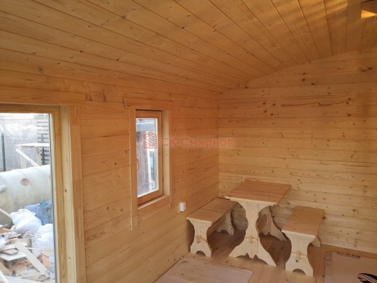 В комплект бани входит стол и две скамейки из доски 19мм, как на фото. Есть комплекты из более толстой доски а также из кедра, смотрите в доп комплектации.