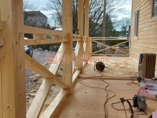 На террасе при условии что она есть делаем перила из строганной доски со всех сторон, столбы террасные также строганные, а не обрезки профилированного бруса с шипом и пазом. Домкратики на столбах для дальнейшей регулировки. Балясины будут сделаны аккуратно. Обратите внимание что в дешёвых случаях это может быть и будет просто вагонка прибирая к неотесанной доске снаружи и столбы будут не квадратные а просто профилированный брус как на видео.