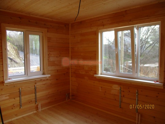 Из профилированного сухого бруса 9х14см, 14х14 см или 14х19 см. Сборка сруба в теплый угол на нагеля или гвозди 200 мм со сверлением отверстия в верхнем брусе (в зависимости от вида бруса).