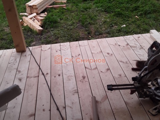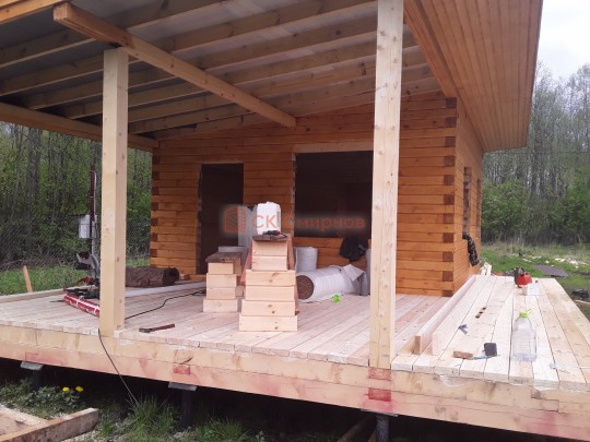 На террасе при условии что она есть делаем перила из строганной доски со всех сторон, столбы террасные также строганные, а не обрезки профилированного бруса с шипом и пазом. Домкратики на столбах для дальнейшей регулировки. Балясины будут сделаны аккуратно. Обратите внимание что в дешёвых случаях это может быть и будет просто вагонка прибирая к неотесанной доске снаружи и столбы будут не квадратные а просто профилированный брус как на видео.