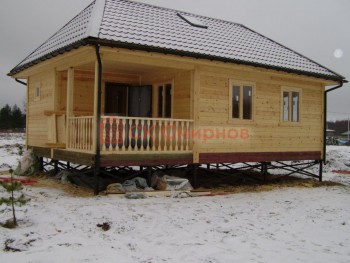 Из профилированного сухого бруса 9х14см, 14х14 см или 14х19 см. Сборка сруба в теплый угол на нагеля или гвозди 200 мм со сверлением отверстия в верхнем брусе (в зависимости от вида бруса).
